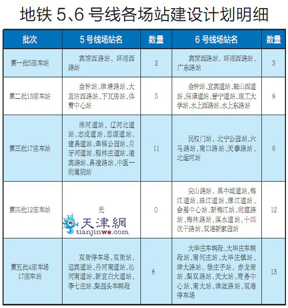 记者从天津昨天召开的地铁5、6号线建设推动会上获悉,作为天津“十二五”期间的重点工程,地铁5、6号线建设今年将出大动作,80座场站将于年内实现全面开工。按照初步计划,5、6号线建设力争于2016年基本完工,届时,地铁1、2、3、5、6、9号线将“联手”为津城百姓编织一张巨大的快速轨道交通网络。