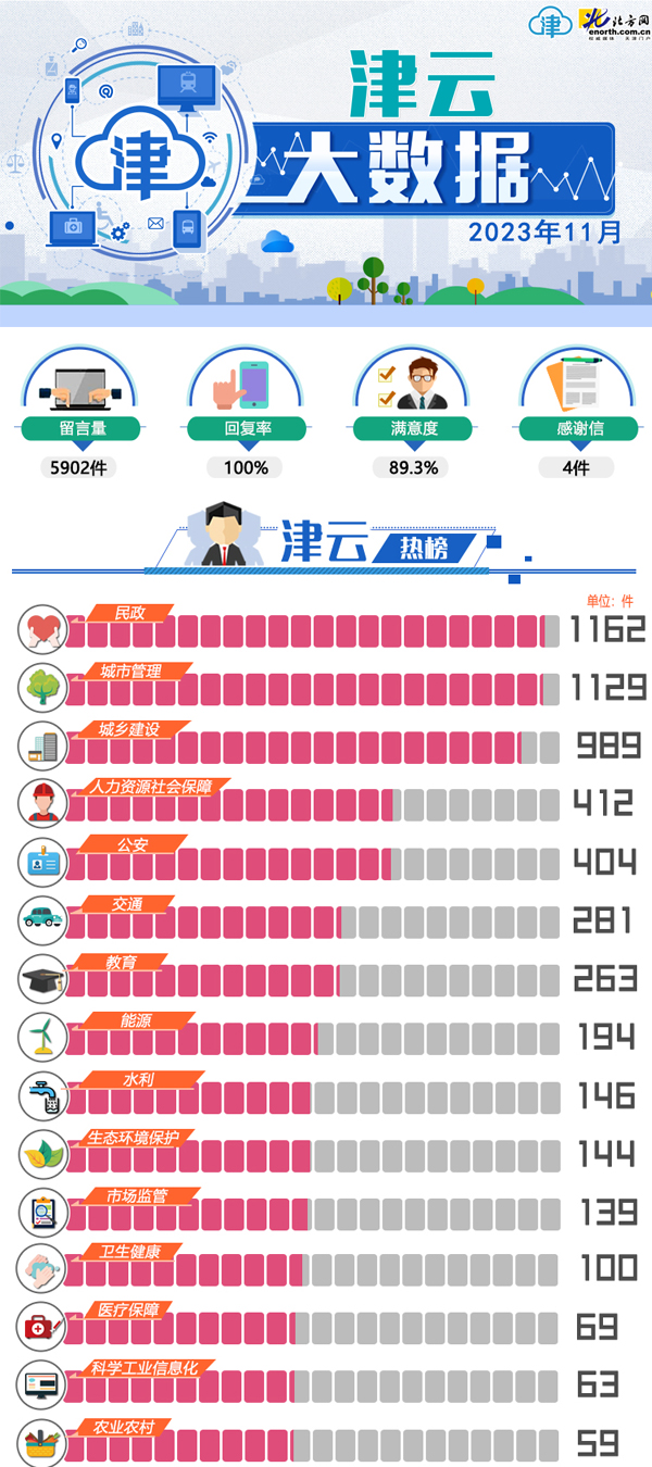 天津北方网讯:2023年11月份,《党群心连心》和《政民零距离》两个栏目共收到网民留言5902件,其中,投诉类留言3032件,咨询类留1435件,求助类留言896件,建议类留言535件,反馈类留言4件。