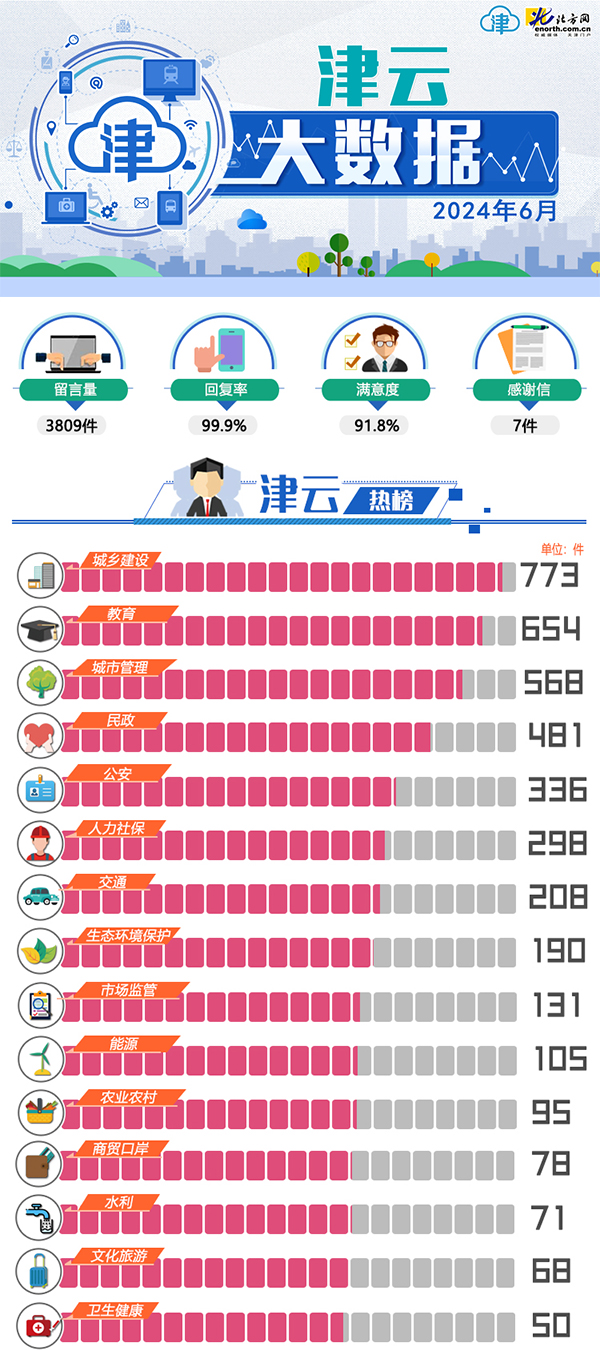 天津北方网讯:2024年6月份,《党群心连心》和《政民零距离》两个栏目共收到网民留言9809件,其中,投诉类留言1369件,咨询类留1392件,建议类留言505件,求助类留言536件,反馈类留言7件。