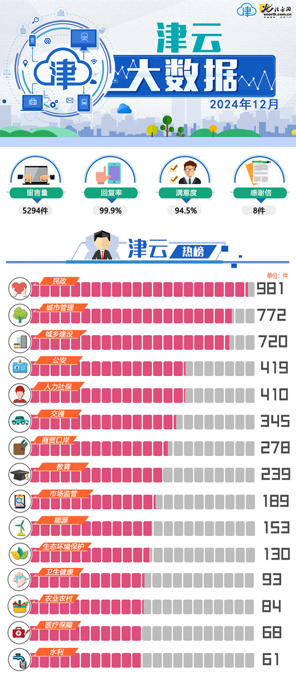 天津北方网讯:2024年12月份,《党群心连心》和《政民零距离》两个栏目共收到网民留言5294件,其中,咨询类留言2074件,投诉类留1886件,求助类留言765件,建议类留言561件,反馈类留言8件。